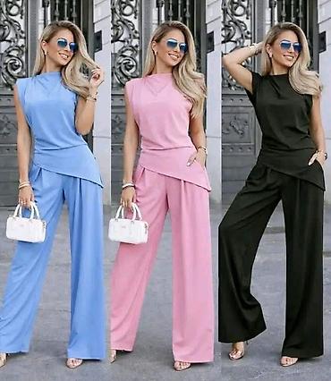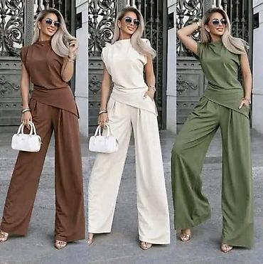 - Kroj: elegantan dvodelni set sa bezrukavnim topom i širokim pantalonama visokog struka. Gornji deo ima asimetričan, preklopni peplum detalj koji vizuelno izdužuje figuru; pantalone su ravnog, lepršavog kroja sa punom dužinom.