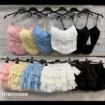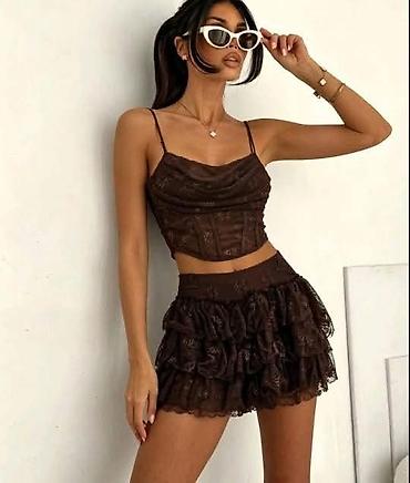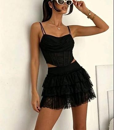 - Dvodijelni set: uski korzet top sa spuštenim (drapiranim) dekolteom i tankim duplim naramenicama + mini suknja sa više volana od čipke.