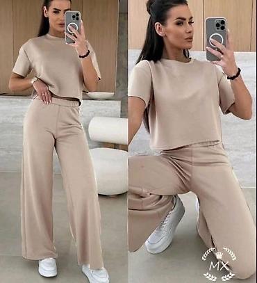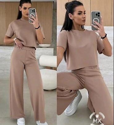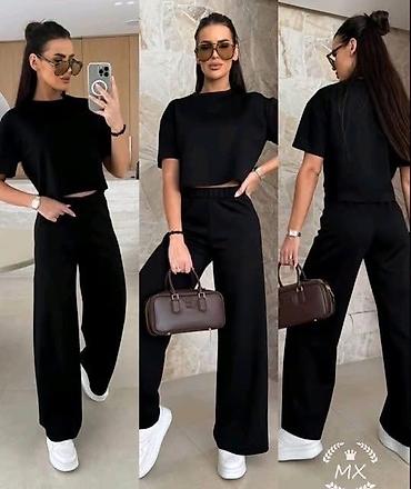 - Donji dio: pantalone sa elastičnim pojasom, ravnih i širokih nogavica za lepršav izgled i udobnost u pokretu.