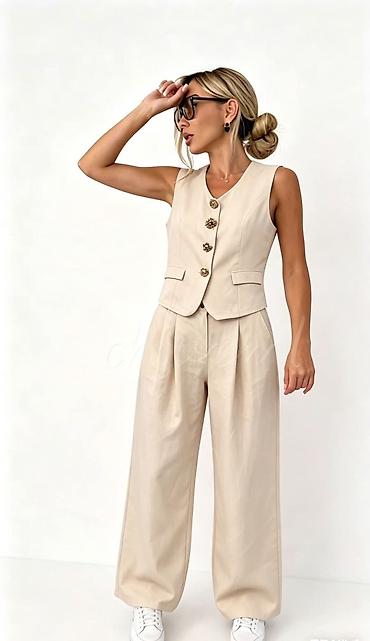 - Kroj: elegantan prsluk bez rukava sa V‑izrezom i formiranim šavovima; pantalone visokog struka sa naborima i širokim nogavicama.