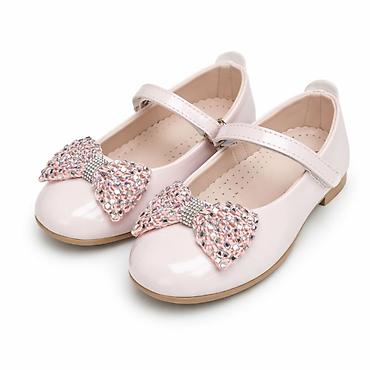 - Elegantne baletanke za devojčice sa sjajnim mašnama napred, ukrašenim sitnim kamenčićima i centralnim detaljem u stilu kristalnih nizova.