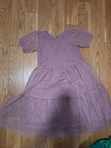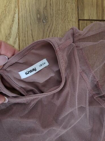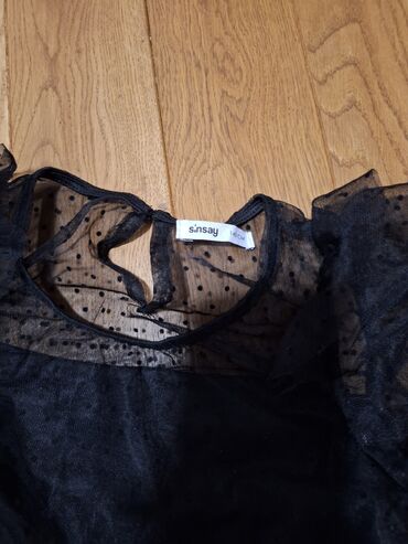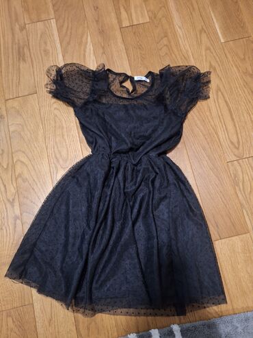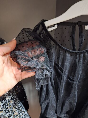 - Detalji: prozirni gornji deo sa tačkicama, kratki naborani rukavi, okrugli izrez sa malim prorezom i kopčanjem pozadi, lepršava suknja do kolena