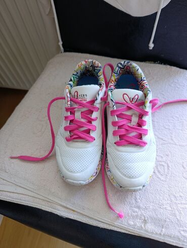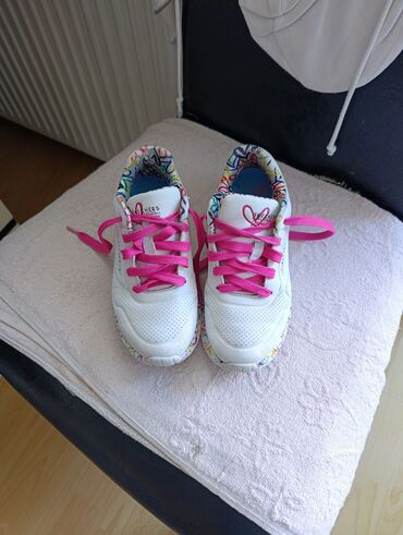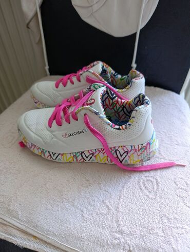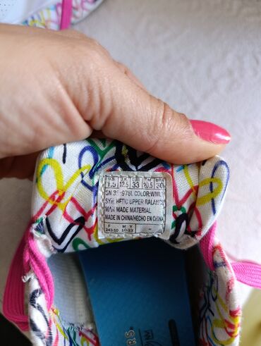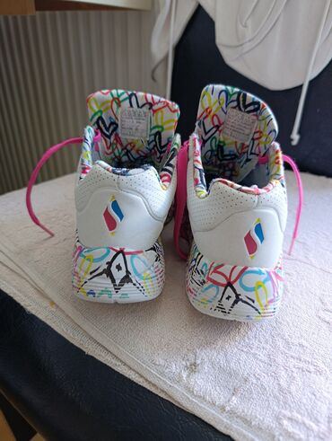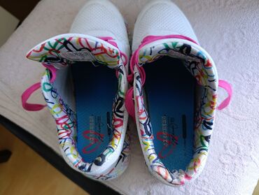 - Boja: belo gornjište sa šarenim, grafiti/heart dezenom na rubu i đonu; jarke roze pertle