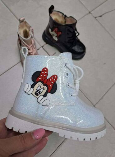- Lakovane gležnjače sa motivom poznatog miša sa mašnicom u više boja (roze, crna, bela sa šljokicama); bočni gumeni aplikativni detalj, praktična petlja za obuvanje.