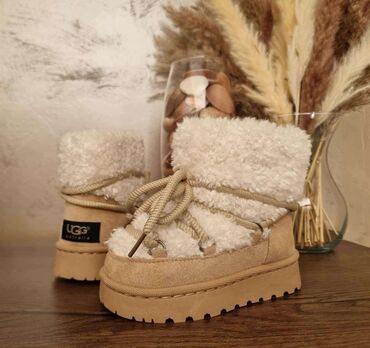 - Pufnaste krznene čizmice u bež nijansi sa omotanim pertlama i logoom pozadi; udobna, “snow boot” silueta.