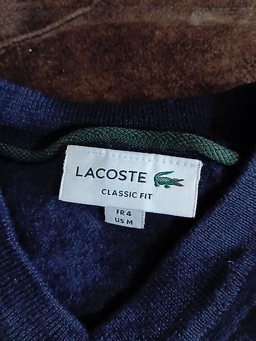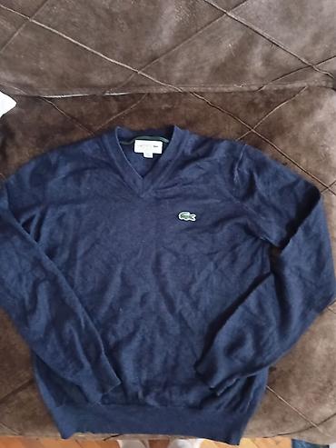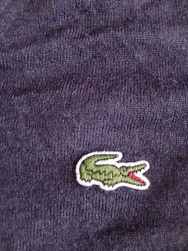 - Džemper Lacoste, tamnoplave boje, V-izrez, dugi rukavi. Prepoznatljiv krokodil logo na grudima. Na etiketi veličina 12A (dečija/tinejdž), klasičan kroj, elastične ranfle na rukavima i pojasu.