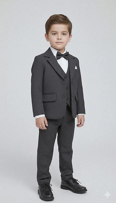 Dečiji svečani komplet – tamnosivi prugasti smoking - Klasičan model sa suptilnim uspravnim prugama u tamnosivoj boji - Set uključuje: sako sa reverima i dva dugmeta, prsluk sa dugmadima, pantalon...