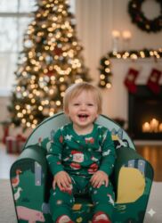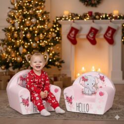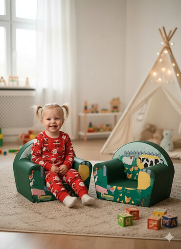 - Dimenzije: kompaktna foteljica pogodna za postavljanje pored jelke, u dnevnoj ili dečijoj sobi; dostupna u više motiva (zeleno sa životinjama farme, roze sa slončetom/leptirima).
