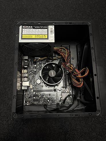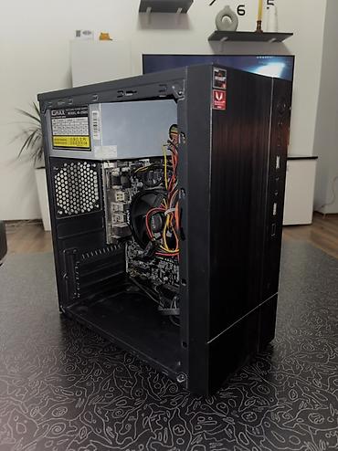 - Kućište: kompaktno crno mATX/mini‑tower, prednji panel sa dugmetom za napajanje, 2x USB, audio konektori; bočna stranica sa perforacijom za dodatni protok vazduha.