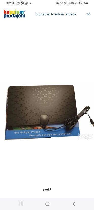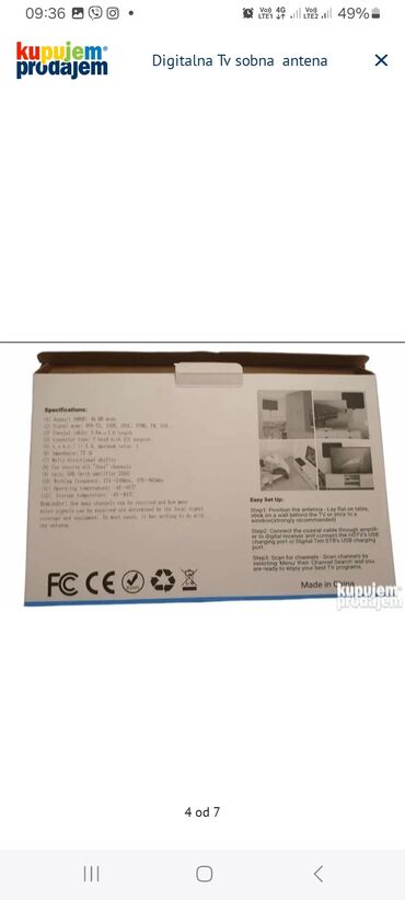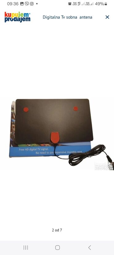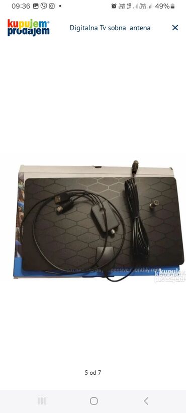 - U kompletu: pločasta antena, koaksijalni kabl sa RF konektorom; na nekim fotografijama prikazan i USB naponski kabl za pojačivač/amplifier (ako je deo kompleta, koristi se za napajanje pojačivača preko USB porta TV‑a ili STB‑a).
