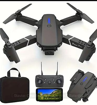 - Paket sadrži: dron, daljinski upravljač, 1 bateriju, USB kabl za punjenje, 4 rezervna propeler‑krilca, 4 zaštitna rama (protective cover), uputstvo, uputstvo za aplikaciju i torbicu za odlaganje.