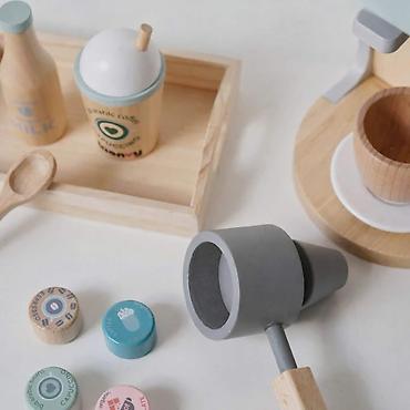 Preslatki drveni aparat za kafu za decu koji mališanima omogućava da se igraju pravljenja kafe kao odrasli. Savršena edukativna igračka koja podstiče maštu i kreativnu igru.