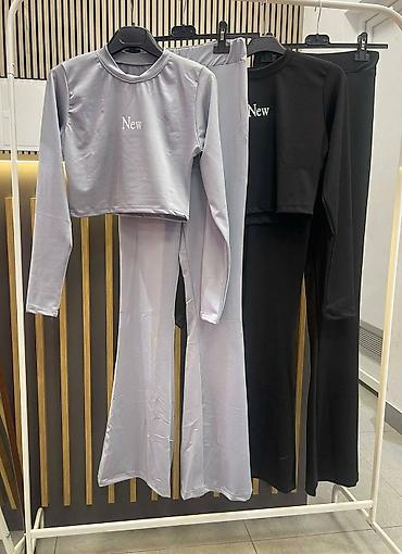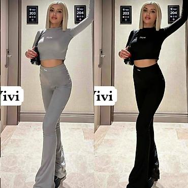- Model: uski kroj koji prati liniju tela; top je kratki (crop) sa dugim rukavima i okruglim izrezom, diskretnim natpisom “New” napred; pantalone visokog struka, elastičan pojas, nogavice šire pri dnu (blago zvonaste).