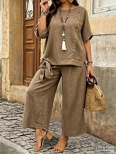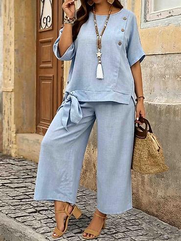 - Detalji dizajna: minimalistička tekstura platna, prirotan izgled, ukrasna dugmad i bočni vez na pantalonama.