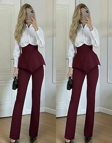 - Boje kompleta: crna i bordo varijanta pantalona sa odgovarajućim visokim strukom; košulja u beloj osnovi sa svetloplavim/neutralnim prugama.