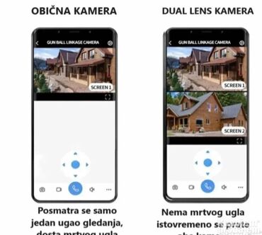 - Prikaz uživo i kontrola sa telefona; poređenje sa običnom kamerom pokazuje potpunu pokrivenost bez slepih uglova.