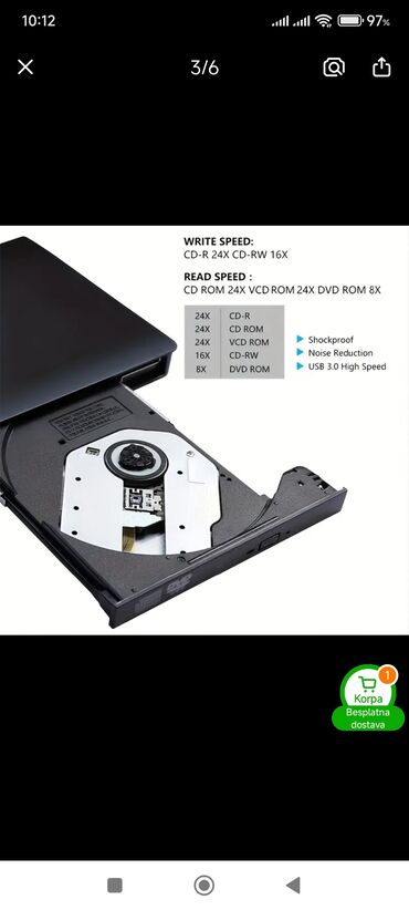 - Funkcije: DVD-ROM čitač, CD-ROM čitač, VCD-ROM čitač, CD-R/RW rezač