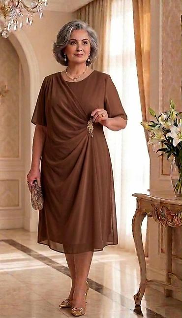 Napomena: Broš je fiksni dekorativni element; dužina haljine i pad materijala prilagođeni su elegantnoj silueti i slobodi kretanja.