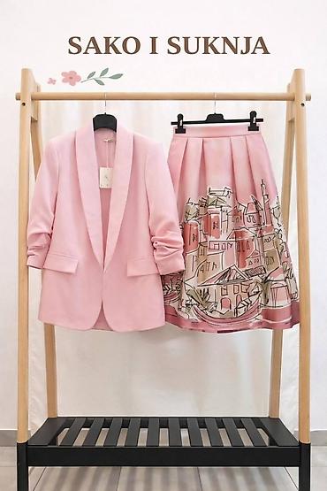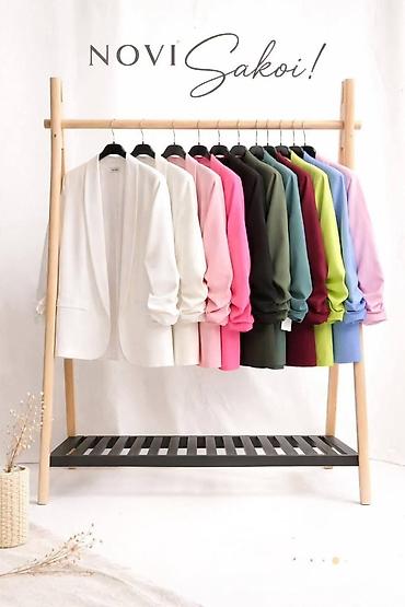 Napomena: Na fotografijama su prikazane varijante u pastelnoroze i svetloplavoj kombinaciji sa odgovarajućim suknjama sa ilustrativnim printom. Kolekcija sakoe nudi široku paletu boja za lako usklađivanje sa print suknjama.