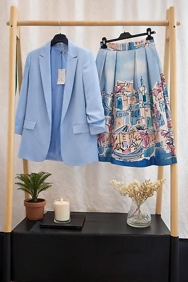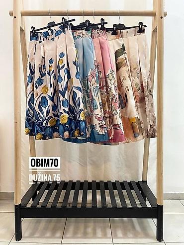 - Suknja: midi dužina sa bogatim faltama, visok struk, zatvaranje pozadi (rajfešlus/kopča), kružni A-kroj koji lepo pada i daje volumen. Različiti printovi u umetničkom stilu (motivi grada, cvetni motivi, pejzaži) u pastelnim i živim tonovima koji se lako kombinuju sa sakoom.