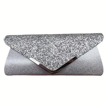 - Torbica tipa pismo (clutch) sa metalnim V detaljem i lancem za nošenje preko ramena. Prednji preklop ukrašen sjajnim štrasom/šljokicama; dostupno u više boja (noćno plava, smaragdno zelena, srebrna). Kompaktna unutrašnjost pogodna za telefon, karmin, ključeve i kartice.