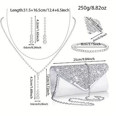 Napomena: Set obuhvata torbicu, ogrlicu, minđuše i narukvicu u odgovarajućoj boji i stilu. Idealno za usklađivanje sa večernjim toaletama.