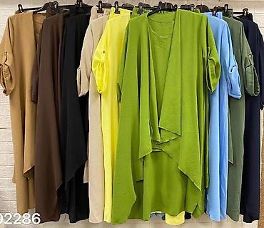 - Komplet se sastoji od tri dela u istoj boji: široka asimetrična kardigan-jaknica bez kopčanja, bluzica bez rukava/sa širokim naramenicama i ravne pantalone sa širim nogavicama.