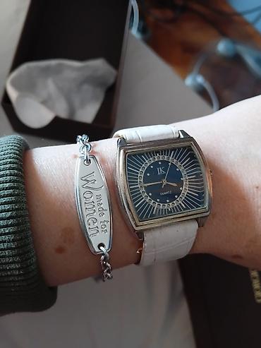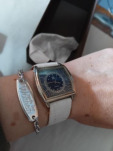 - Sat: pravougaono/bačvasto kućište u srebrnoj boji, tamnoplavo brojčanik sa dekorativnim radijalnim markerima i kružnim akcentima, tri kazaljke (sati, minuti, sekunde), kvarcni mehanizam. Na brojčaniku oznaka IK i natpis Quartz. Mineralno staklo, krunica sa desne strane. Bela kožna/eko-kožna narukvica sa teksturom krokodila, klasična kopča na rupice u srebrnoj boji.