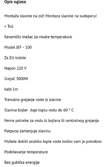- U kompletu: telo slavine sa grejačem, izlivena cev, tuš ručica sa crevom, držač tuša, set prstenova i priključaka, napojni kabl 1 m