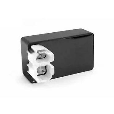 - Kompaktan pravougaoni modul u crnom kućištu sa dva bela, stekna (jedan iznad drugog) konektora na jednom kraju.