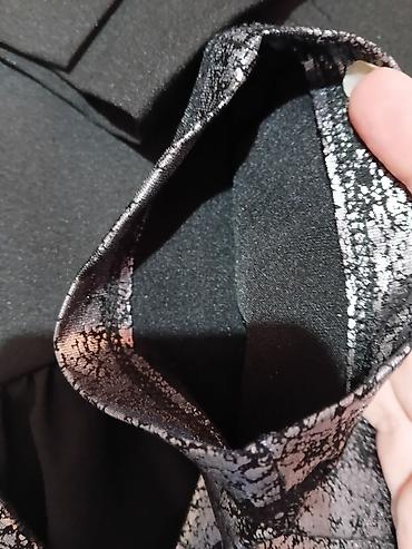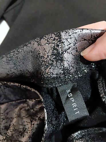 - Pantalone: brend Esprit. Elastičan struk bez kopčanja, uski kroj (leggings/skinny stil). Materijal sa metalik srebrnim sjajem i apstraktnim “crackle”/mermernim desenom preko crne podloge, rastegljiv i udoban za kretanje. Glatka unutrašnjost za prijatno nošenje.