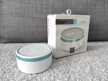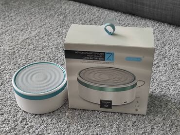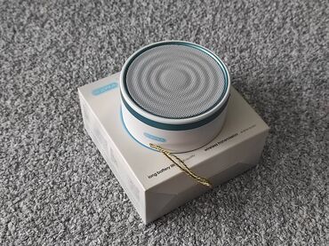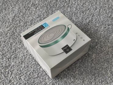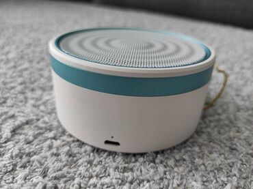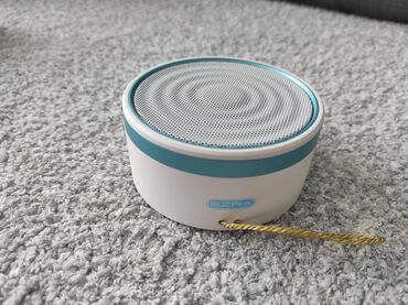 - Kompaktan prenosivi zvučnik kružnog oblika, bele boje sa tirkiznim akcentom i metalnom mrežicom na vrhu