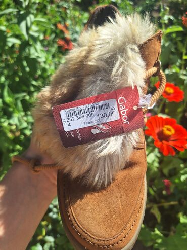 Braon Gabor ženske gležnjače sa plitkim profilom, izrađene od materijala nalik antilopu, sa dodatkom svetlo smeđeg veštačkog krzna oko otvora. Pertle u boji obuće prolaze kroz metalne ringlice, obezbeđujući sigurno prianjanje. Debeli đon sa rebrastom teksturom pruža stabilnost. Ove gležnjače su pogodne za svakodnevno nošenje u hladnijim mesecima, kombinujući stil i udobnost.