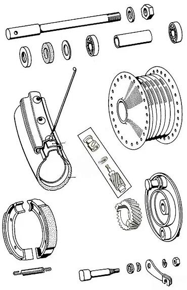 - Pogodno za servis i reparaciju kočionih sklopova prikazanih na tehničkom crtežu (bubanj, ležajevi, opruge, poluga aktivacije).