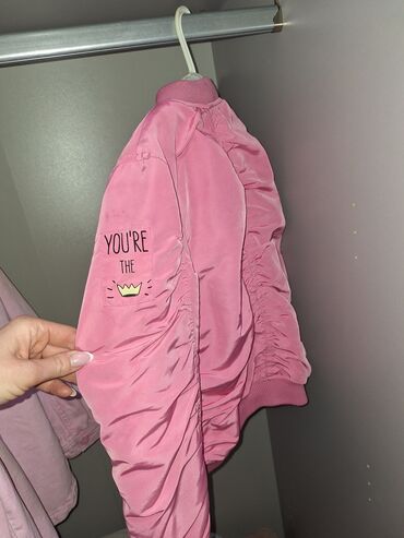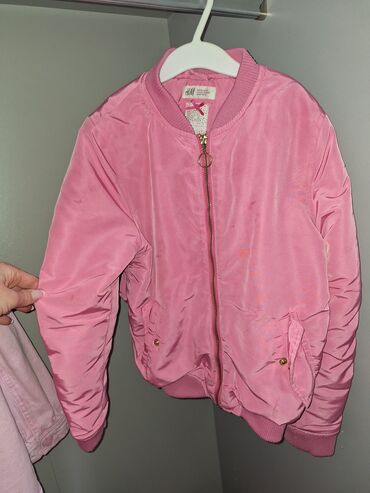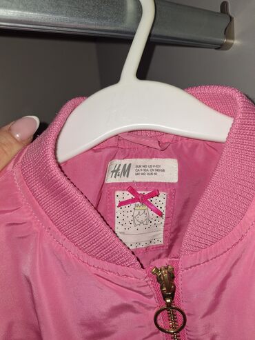 - Jakna: roza H&M bomber, veličina EUR 140 / US 9–10Y. Zatvaranje rajsferšlusom sa prstenastim klizačem u zlatnoj boji. Dva prednja džepa sa dugmićima, rebraste ranfle na rukavima i na struku. Na rukavu natpis “YOU’RE THE” sa malom krunom. Unutra etiketa sa mašnicom i krunom.