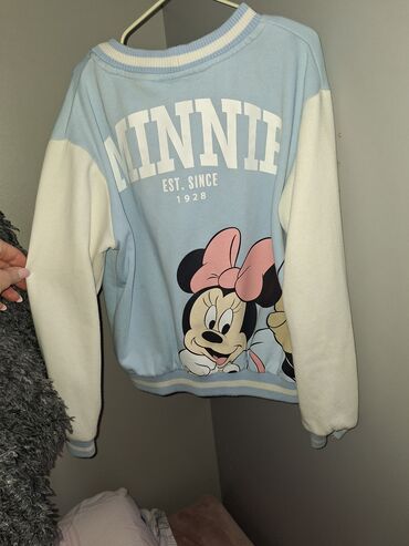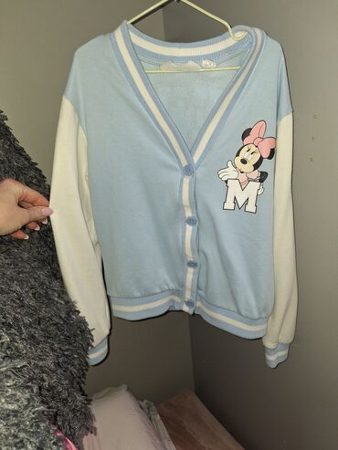 - Džemper/kardigan: svetloplava i krem kombinacija, kopčanje na dugmad, pruge na okovratniku, manžetnama i pojasu. Napred štampa Minnie Mouse sa slovom “M”. Dug rukav, lagan i udoban sloj za svakodnevno nošenje.