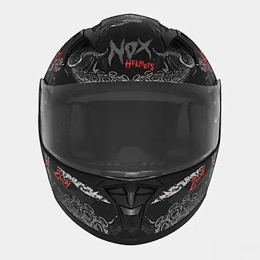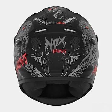 - Brend/model: NOX Helmets (grafika sa zombie/horor motivima u crno‑sivoj kombinaciji sa crvenim detaljima i logotipovima)