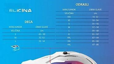 - Odrasli: XXS 51–52, XS 53–54, S 55–56, M 57–58, L 59–60, XL 61–62, XXL 63–64, 3XL 65–66, 4XL 67–68