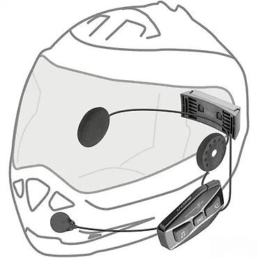 - Komplet za ugradnju u integralne i preklopne kacige: tanki zvučnici sa čičak podlogama, mikrofon na savitljivoj grani, spoljašnja kontrolna jedinica i nosač/stezaljka.