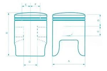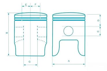 - Standardna geometrija prema tehničkom crtežu na fotografiji (A, B, C, D, E, F, G, J). Proveriti prečnik klipa i visine u odnosu na vaš cilindar/preporuke proizvođača motora.