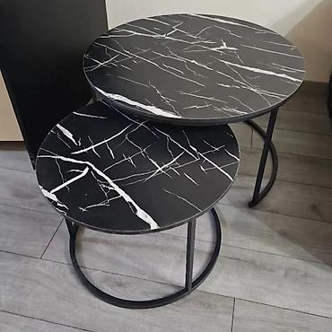 Set klub stolova – 2 komada - Dizajn: moderni „nesting“ set okruglih klub stolova koji se uvuču jedan ispod drugog radi uštede prostora. - Ploče: svetle (mermerni izgled), glatka površina, jednost...