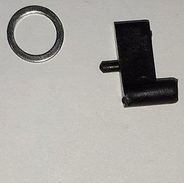 - Plastični zglobni osigurač/L‑nosač sa čepom (crni), namenjen za zaključavanje ili vođenje malih mehaničkih sklopova.