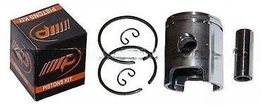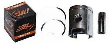 Komplet klipa za motor, dizajniran za efikasne performanse. Uključuje klip, karike, osovinicu klipa i osigurače. Klip je izrađen od metala, obezbeđujući izdržljivost i pouzdanost. Komplet je pogodan za zamenu ili remont motora, obezbeđujući pravilno funkcionisanje unutrašnjeg sagorevanja. Crna kutija sa natpisom "PISTONS KIT" označava sadržaj pakovanja.