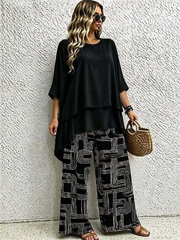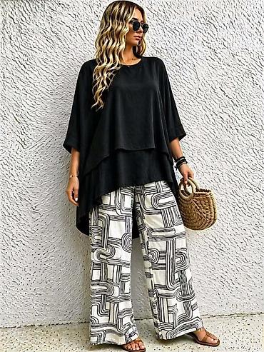 - Donji deo: široke, ravne pantalone visokog komfora. Geometrijski/abstraktan print u kontrastu – dostupne varijante: svetla osnova sa crnim linijama ili crna osnova sa svetlim linijama.