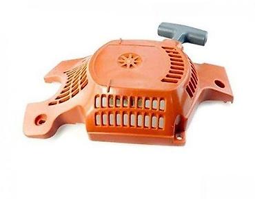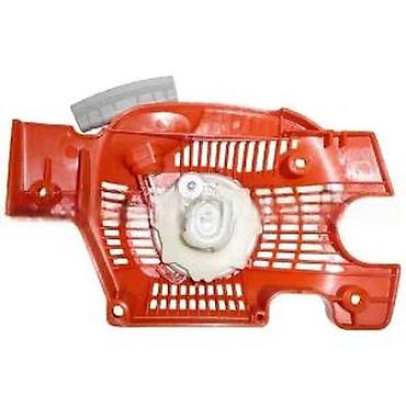 Kompletan starter sklop za motorne testere, dizajniran da omogući pouzdano pokretanje uređaja. Izrađen je od izdržljive plastike u narandžastoj boji, sa integrisanom ručkom za povlačenje u sivoj boji. Sklop uključuje sve potrebne komponente za mehanizam za pokretanje, uključujući oprugu i točak za namotavanje užeta, vidljive sa donje strane. Otvori za ventilaciju su strateški postavljeni na kućištu kako bi se obezbedila optimalna funkcionalnost. Idealan je kao zamenski deo za održavanje ili popravku motorne testere.