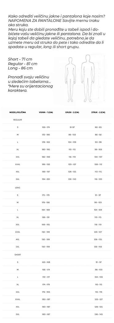- Za jaknu merite obim grudi i struka; za odabir grupe visine izmerite dužinu od struka do pete pa uporedite sa Short/Regular/Long.