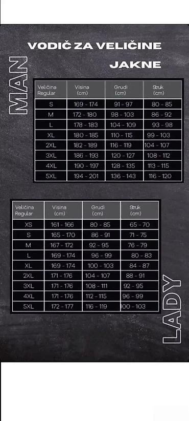 - S: visina 169–174 cm, grudi 91–97 cm, struk 80–85 cm
