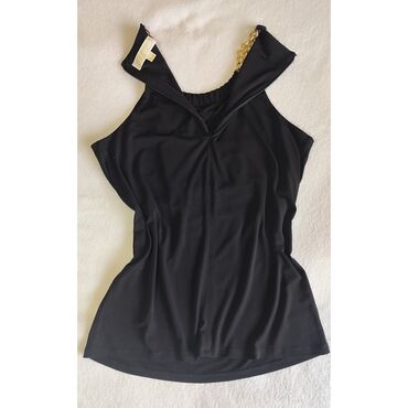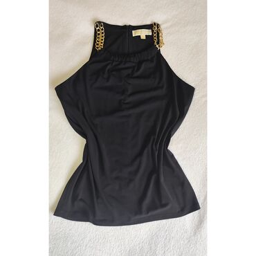 Michael Kors bluza bez rukava u crnoj boji. Elegantna halter silueta sa zlatnim lancima na naramenicama kao dekorativnim detaljem. Materijal je gladak i padajući, sa blagim strukiranjem koje prati liniju tela. Visoka zatvorena kragna, skriveni rajsferšlus na leđima. Dužina blago produžena pozadi.