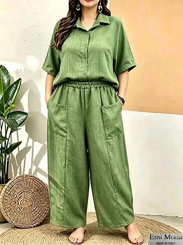 - Dvodijelni ženski komplet od lagane tkanine: košulja kratkih rukava + široke pantalone.