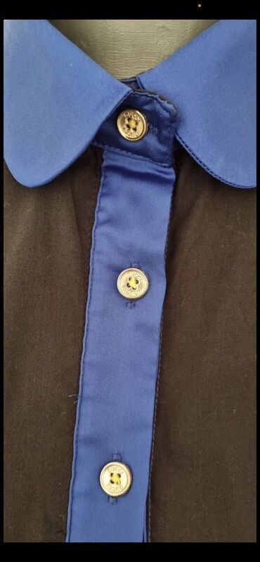 - Boja: osnovna crna; kontrastni detalji u intenzivno plavoj (kragna, manžetne i preklop sa dugmadima)